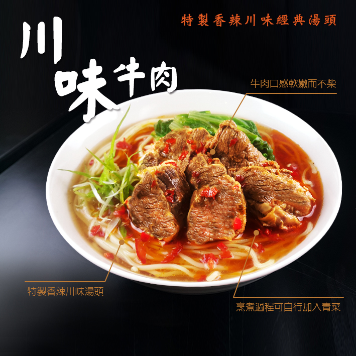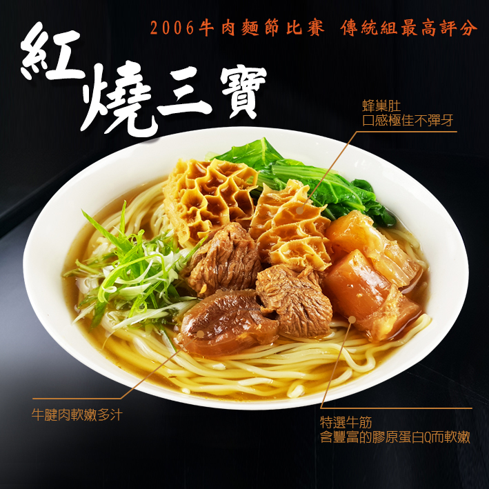 洪師父經典三種口味牛肉湯,紅燒、川味、牛三寶,冠軍美味即刻享受。